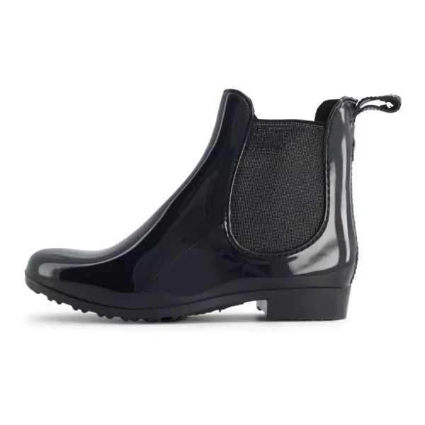 מגפיים שחורים מבריקים לנשים, עמידים במים, טבעוניים, לחורף, עם נגיעה נוצצת בפאנל הגומי הנוצץ.