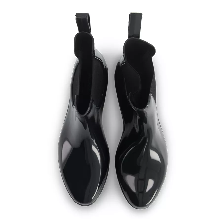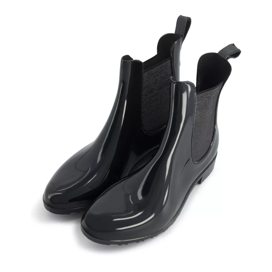 מגפיים שחורים מבריקים לנשים, עמידים במים, טבעוניים, לחורף, עם נגיעה נוצצת בפאנל הגומי הנוצץ.