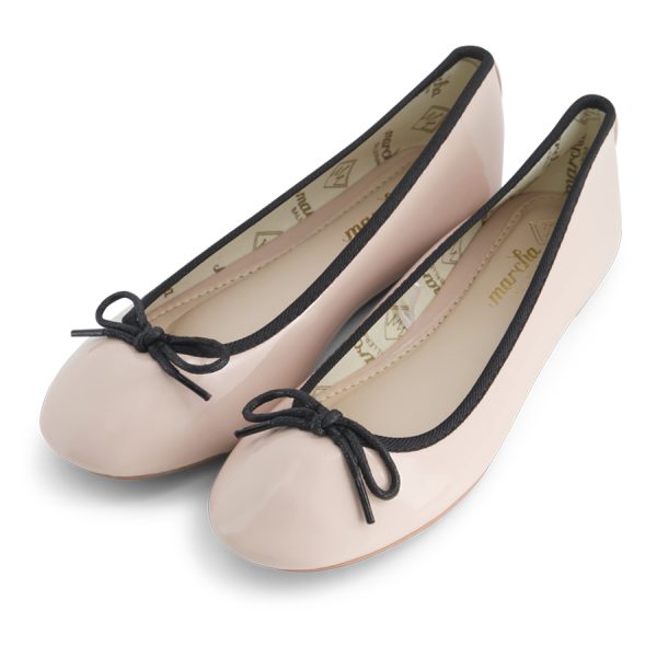 Enjoy the classic elegance of these beige ballerina-style flat shoes, with contrasting black trim